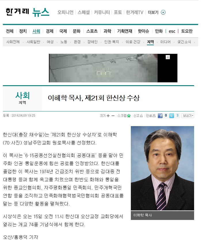 ÀÌÇØÇÐ ¸ñ»ç, Á¦21ȸ ÇѽŻó ¼ö»ó[ÇѰܷ¹½Å¹®]